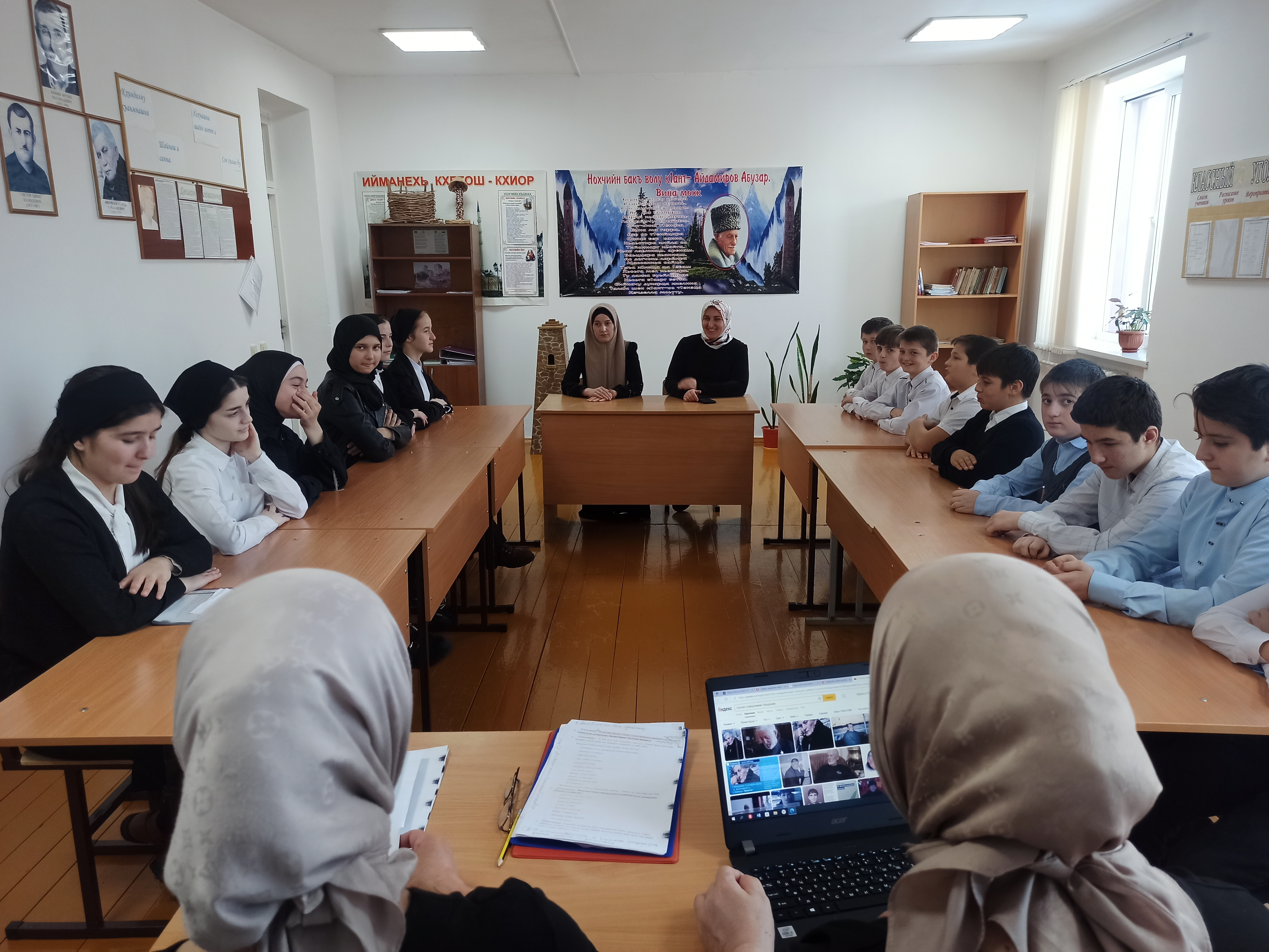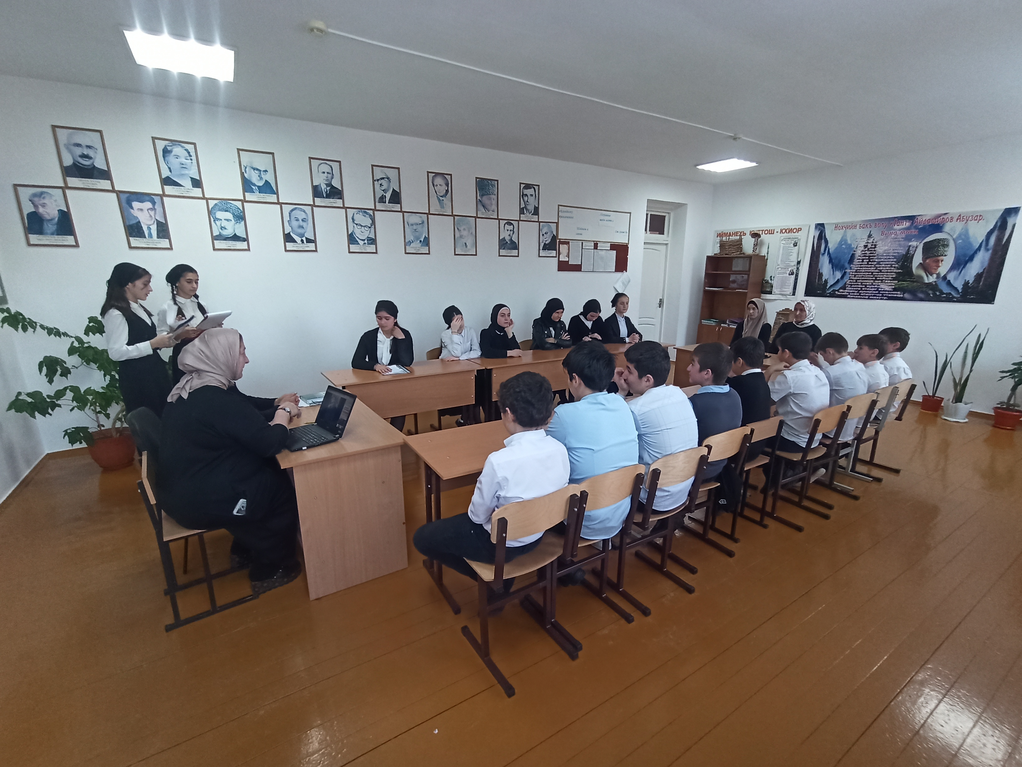 Очередное мероприятие: Круглый стол "Дайн мотт-инзаре, оьзда, токхе" прошел сегодня в школе. Дети собрались в кабинете чеченского языка. В кабинете висели портреты поэтов и писателей, уголки писателю Айдомирову А., писателю односельчанину Яшуркаеву С., цитаты А.Х.Кадырова, цветы и столы поставленные в круг. На Круглом столе присутствовали организаторы мероприятия Чатаева Я. и Буштурова Х. учителя родного языка, учащиеся 6-8 классов и учителя других предметов. Дети-ведущие рассказали об истории родного языка начиная с П.К.Услара и до сегодняшнего дня. Дети читали стихи и обсуждали их содержание. Приводили цитаты выдающихся личностей, про наш родной язык. Мероприятие было интересным и плодотворным. В конце мероприятие были озвучены задачи на ближайший период.