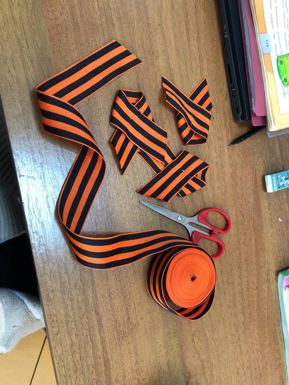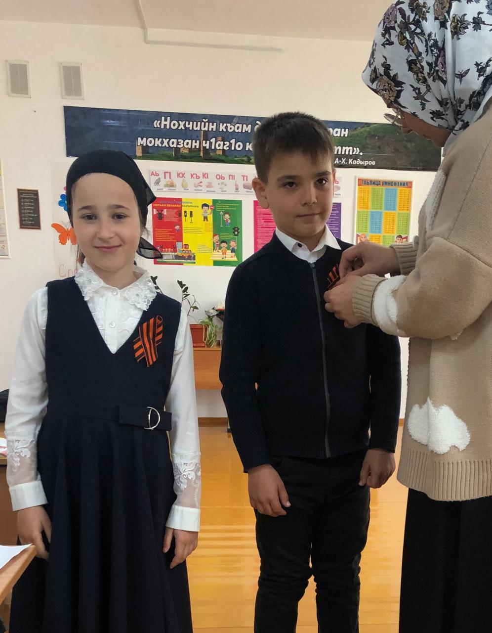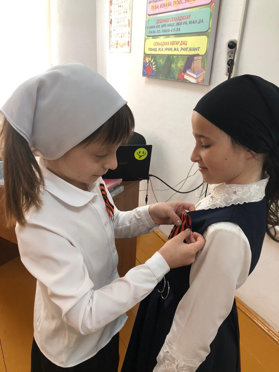 Учащиеся 3 класса приняли участие в акции "Георгиевская лента". Вместе со своим руководителем они приобрели георгиевскую ленту и булавки для их крепления. На большой перемене были розданы и прикреплены к груди более 50-ти учащимся и 20-ти работникам и 10-ти прохожим перед МБОУ "Эшилхатойская СОШ"