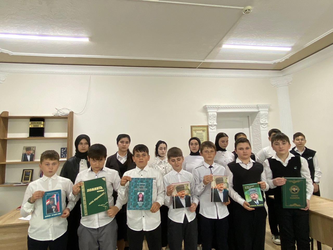 Выставка рисунков и книг в школьном музее А-Х.Кадырова. Такую акцию провели активисты школьного клуба "Юные Кадыровцы" приуроченная ко дню памчти и скорби
