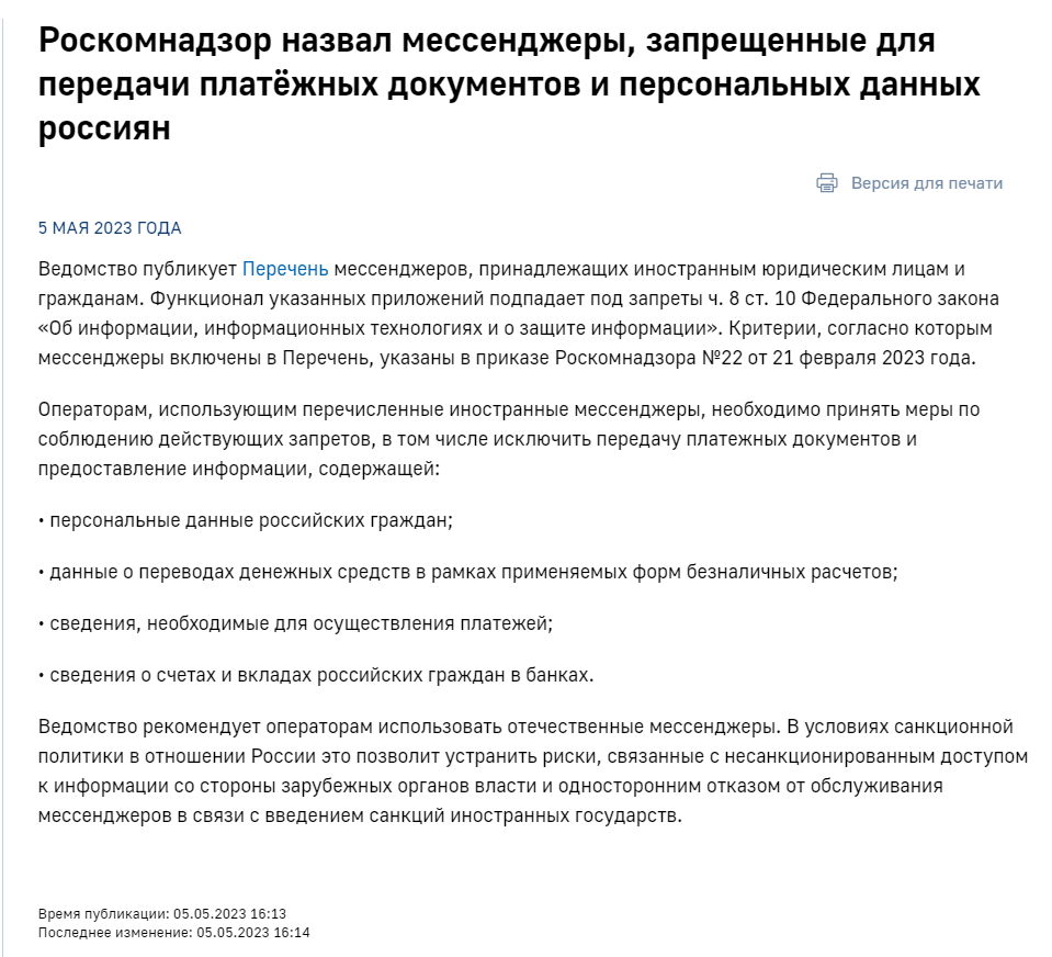 20.09.2024ч 8. ст 10 149-ФЗ. Запрещается при предоставлении государственных и муниципальных услуг, выполнении государственного или муниципального задания, а также при реализации государственными компаниями, государственными и муниципальными унитарными предприятиями, публично-правовыми компаниями, хозяйственными обществами, в уставном капитале которых доля участия Российской Федерации, субъекта Российской Федерации, муниципального образования в совокупности превышает пятьдесят процентов, кредитными организациями, некредитными финансовыми организациями, которые осуществляют указанные в части первой статьи 76.1 Федерального закона от 10 июля 2002 года N 86-ФЗ "О Центральном банке Российской Федерации (Банке России)" виды деятельности, субъектами национальной платежной системы товаров, работ, услуг, имущественных прав использование принадлежащих иностранным юридическим лицам и (или) иностранным гражданам информационных систем и (или) программ для электронных вычислительных машин, которые предназначены и (или) используются для обмена электронными сообщениями исключительно между пользователями этих информационных систем и (или) программ для электронных вычислительных машин, при котором отправитель электронного сообщения определяет получателя или получателей электронного сообщения и не предусматривается размещение пользователями сети "Интернет" общедоступной информации в сети "Интернет", для передачи платежных документов и (или) предоставления информации, содержащей персональные данные граждан Российской Федерации, данные о переводах денежных средств в рамках применяемых форм безналичных расчетов, сведения, необходимые для осуществления платежей и (или) сведения о счетах (вкладах) граждан Российской Федерации в банках.