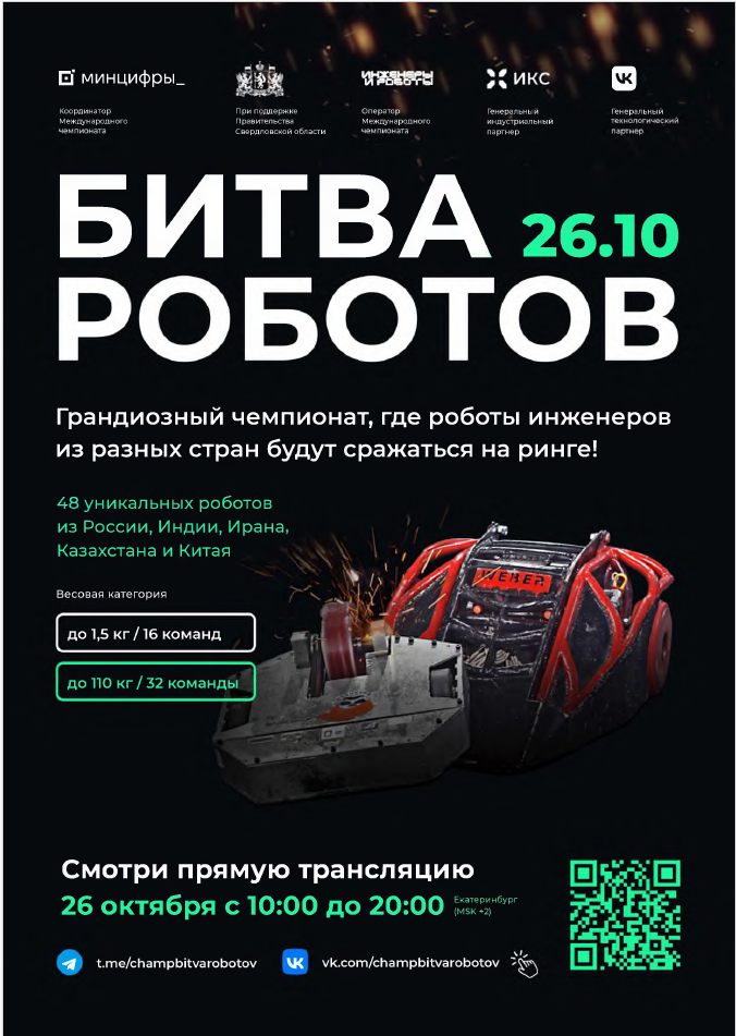 Уважаемые коллеги! Минцифры России в соответствии с распоряжением ПравительстваРоссийской Федерации от 11 апреля 2023 г. № 889-р сообщает о проведении второгоотборочного этапа Международного чемпионата по битве роботов (далее -Чемпионат), который способствует продвижению инженерной мысли как драйвераразвития и поддержки современных цифровых технологий.Первый отборочный этап Чемпионата прошел 28 сентября 2024 г. на площадке«ЦСКА Арена» в г. Москве, в котором приняли участие 48 команд из России,Беларуси, Бразилии, Индии, Ирана и Китая.Второй отборочный этап Чемпионата состоится 26 октября 2024 г.при поддержке Правительства Свердловской области на территории международноговыставочного центра «Екатеринбург-Экспо» (павильон № 4) по адресу:г. Екатеринбург, бульвар ЭКСПО-бульвар, 2 (далее - мероприятие). Участникивторого этапа Чемпионата - 48 команд из России, Индии, Казахстана, Ирана и Китая.Мероприятие пройдет с 10:00 до 20:00.С учетом высокой социальной значимости Чемпионата и его международногостатуса просим оказать содействие в продвижении Чемпионата путем размещенияинформации о мероприятии на доступных информационных ресурсах региона,а также разместить в период с 21 по 26 октября 2024 г. информационный баннер(прилагается) со ссылкой на прямую трансляцию Чемпионата в сети «Интернет»по адресу https://vk.com/video-219465931_456240225 в информационных системах,используемых в учебном процессе в образовательных организациях, в целяхинформирования обучающихся о мероприятии. Высшим должностным лицам субъектов Российской Федерации (по списку) 2 Принимая во внимание сроки проведения мероприятия, просим не позднее 21 сентября 2024 г. сообщить о размещении информации на электронный адресa. tenisheva@digital. gov. ru.