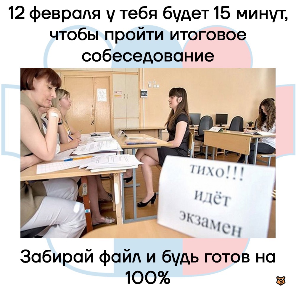 12 февраля у тебя будет 15 минут, чтобы пройти итоговое собеседование.